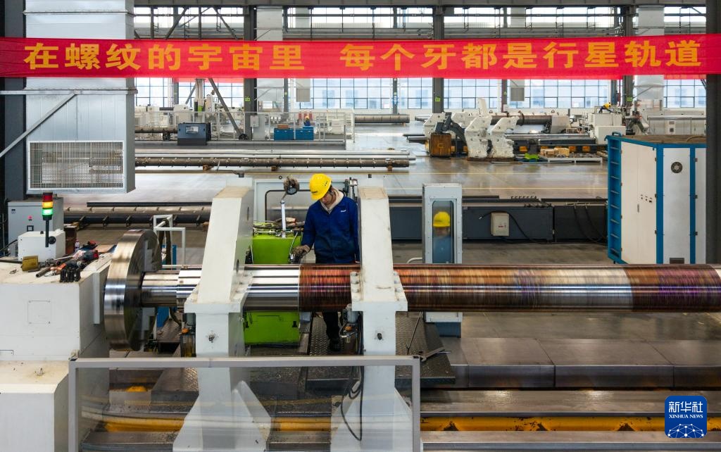 1月14日,在坐落常德高新区的湖南特力液压有限公司,工人在出产超长型液压油缸(无人机相片)。