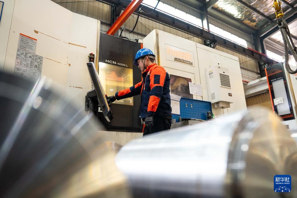 1月14日,在坐落常德高新区的湖南佳鸿机械股份有限公司,工人在出产风力发电机滑动轴承。