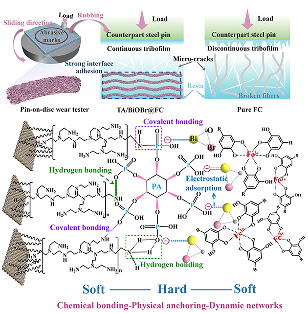 团队人员在此基础上提出了在纤维织物表面构建“软-硬-软”结构增强复合材料的摩擦学性能的磨损机理。未经改性的复合材料在受到外部挤压和剪切力的作用下,出现大量的微裂纹并伴随纤维严重拔出断裂,随后在对偶表明产生不均匀不连续的摩擦膜。而TA/BiOBr@FC经由表界面改性,织物界面从微观到宏观形成了化学键合-物理锚定-动态网络的多级增强体系,避免纤维-树脂界面脱黏和纤维拔出,明显提升了CF/PTFE纤维织物复合材料的界面性能和摩擦学性能。